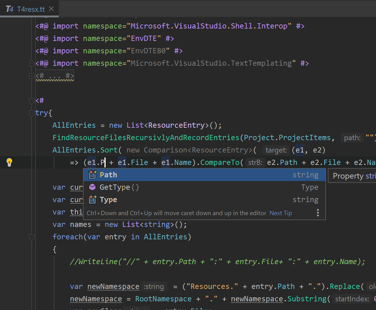 Maintenant, vous pourrez facilement exécuter, traiter et déboguer tous vos modèles T4 dans Rider. Vous apprécierez la nouvelle assistance interne à l'éditeur, qui comprend :